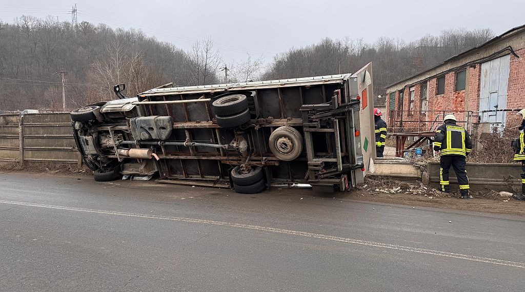 Un autocamion încărcat cu tuburi de oxigen s-a răsturnat astăzi, pe Calea Țerovei din Reșița.
