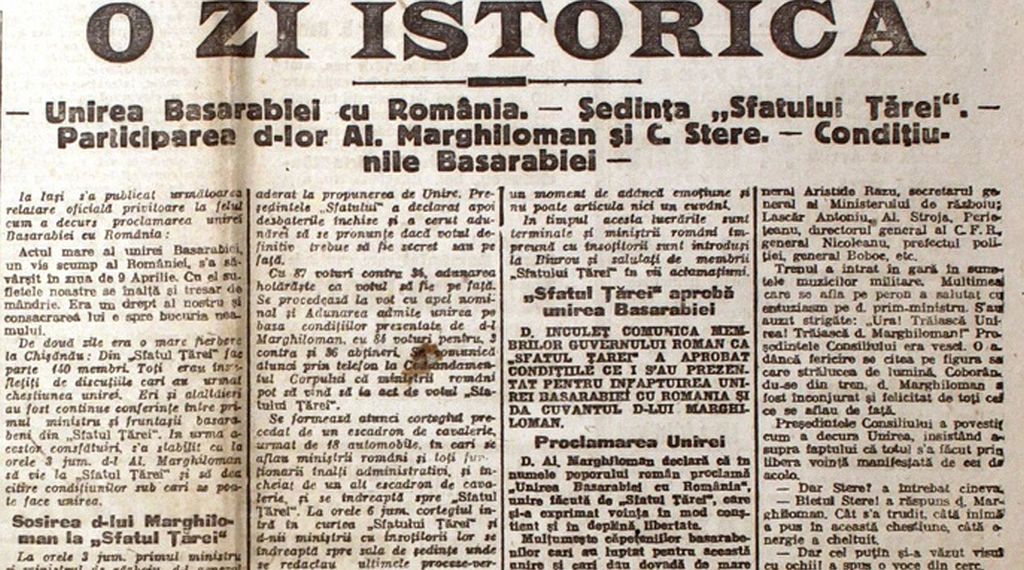 „În 1918, Sfatul Ţării de la Chişinău, întrunit în şedinţă solemnă, a votat Unirea provinciei româneşti Basarabia cu România. Preşedintele Sfatului Ţării Ion Inculeţ şi secretarul Ion Buzdugan au semnat Declaraţia de Unire, în care se specifica: „Republica Democratică Moldovenească (Basarabia) în hotarele ei dintre Prut, Nistru, Dunăre, Marea Neagră şi vechile graniţe cu Austria, ruptă de Rusia acum o sută şi mai bine de ani din trupul vechii Moldove, în puterea dreptului istoric şi a dreptului de neam, pe baza principiului că noroadele singure să-şi hotărască soarta lor, de azi înainte şi pentru totdeauna se uneşte cu mama sa România”, potrivit lucrării „Istoria României în date” (Ed. Enciclopedică, 2003).