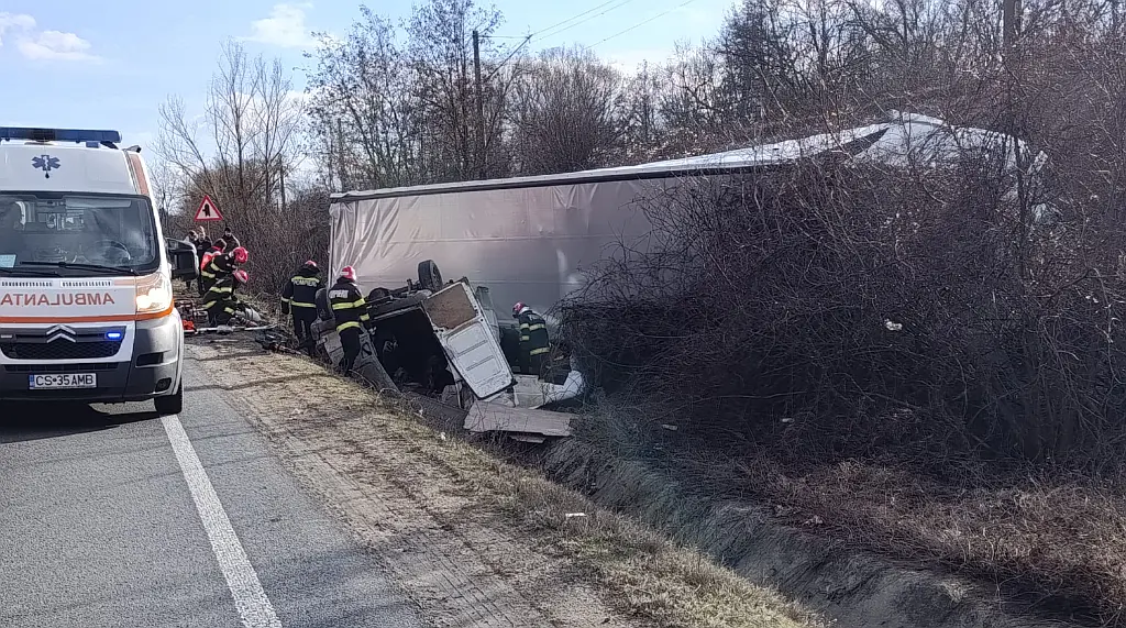 Accident grav pe DN 6, în zona Cornea: o persoană încarcerată după coliziunea dintre un autocamion și un microbuz de marfă.