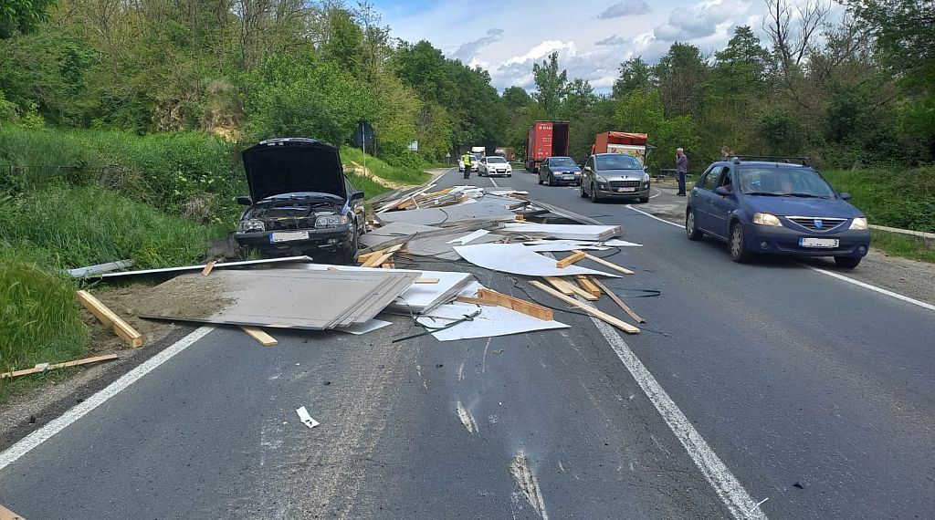 Asta după ce unui autotren care transporta plăci i s-au rupt chingile de siguranță, iar marfa a picat pe carosabil, lovind un autoturism care circula din sens opus.