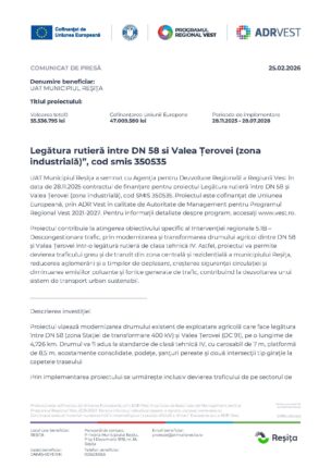 Proiect „Legătura rutieră între DN 58 și Valea Țerovei”