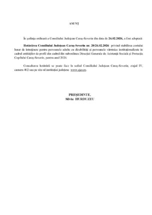Hotărârea Consiliului Județean Caraș-Severin nr. 20/26.02.2026