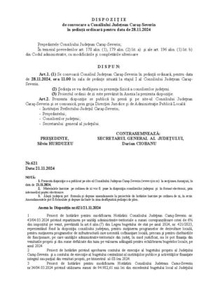 D I S P O Z I Ţ I E de convocare a Consiliului Judeţean Caraş-Severin în şedinţă ordinară pentru data de 14.11.2024 Preşedintele Consiliului Judeţean Caraş-Severin; În temeiul prevederilor art. 178 alin. (1), 179 alin. (2) lit. a) şi ale art. 196 alin. (1) lit. b) din Codul administrativ, cu modificările și completările ulterioare […]