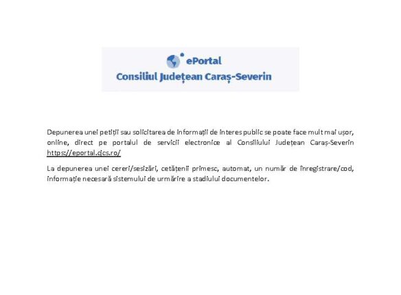 Depunerea unei petiții sau solicitarea de informații de interes public se poate face mult mai ușor, online, direct pe portalul de servicii electronice al Consiliului Județean Caraș-Severin https://eportal.cjcs.ro/ La depunerea unei cereri/sesizări, cetățenii primesc, automat, un număr de înregistrare/cod, informație necesară sistemului de urmărire a stadiului documentelor.