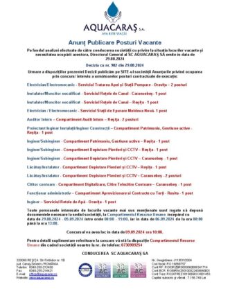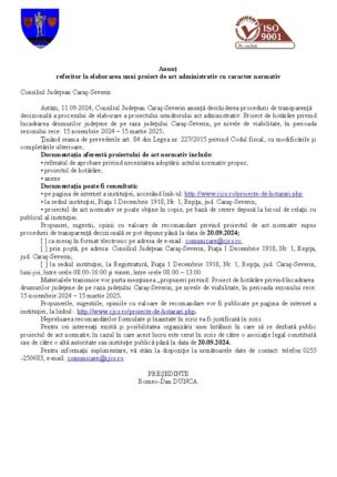 D I S P O Z I Ţ I E de convocare a Consiliului Judeţean Caraş-Severin în şedinţă ordinară pentru data de 30.09.2024 Preşedintele Consiliului Judeţean Caraş-Severin; În temeiul prevederilor art. 178 alin. (1), 179 alin. (2) lit. a) şi ale art. 196 alin. (1) lit. b) din Codul administrativ, cu modificările […]