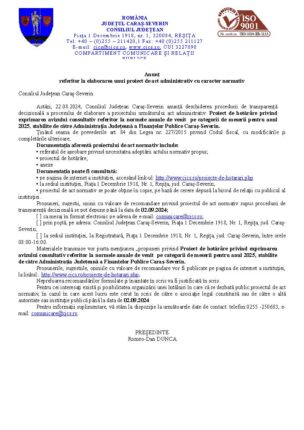 Anunţ referitor la elaborarea unui proiect de act administrativ cu caracter normativ Consiliul Județean Caraș-Severin Astăzi, 22.08.2024, Consiliul Județean Caraș-Severin anunţă deschiderea procedurii de transparenţă decizională a procesului de elaborare a proiectului următorului act administrativ: Proiect de hotărâre privind exprimarea avizului consultativ referitor la normele anuale de venit pe categorii de meserii pentru anul 2025, […]