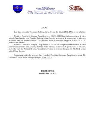 Hotărâri ale Consiliului Județean Caraș-Severin din data de 30.05.2024