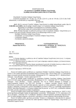 D I S P O Z I Ţ I E de convocare a Consiliului Judeţean Caraş-Severin în şedinţă extraordinară pentru data de 13 iunie 2024 Preşedintele Consiliului Judeţean Caraş-Severin; În temeiul prevederilor art. 178 alin. (2), 179 alin. (2) lit. b) şi ale art. 196 alin. (1) lit. b) din Codul administrativ, cu modificările […]