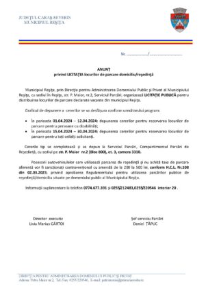 ANUNŢ privind LICITAŢIA locurilor de parcare domiciliu/reşedinţă Municipiul Reşiţa, prin Direcţia pentru Administrarea Domeniului Public şi Privat al Municipiului Reşiţa, cu sediul în Reşiţa, str. P. Maior, nr.2, Serviciul Parcări, organizează LICITAŢIE PUBLICĂ pentru distribuirea locurilor de parcare declarate vacante din municipiul Reșița. Graficul de depunere a cererilor se va desfășura conform […]