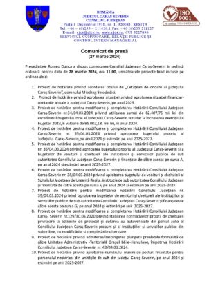 Comunicat de presă (27 martie 2024) Președintele Romeo Dunca a dispus convocarea Consiliul Judeţean Caraş-Severin în şedinţă ordinară pentru data de 28 martie 2024, ora 11:00, următoarele proiecte fiind incluse pe ordinea de zi: Proiect de hotărâre privind acordarea titlului de „Cetățean de onoare al județului Caraș-Severin”, domnului Miodrag Belodedici. Proiect de […]