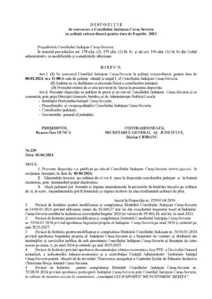 D I S P O Z I Ţ I E de convocare a Consiliului Judeţean Caraş-Severin în şedinţă extraordinară pentru data de 8 aprilie 2024 Preşedintele Consiliului Judeţean Caraş-Severin; În temeiul prevederilor art. 178 alin. (2), 179 alin. (2) lit. b) şi ale art. 196 alin. (1) lit. b) din Codul administrativ, cu […]