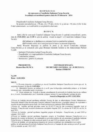 D I S P O Z I Ţ I E de convocare a Consiliului Judeţean Caraş-Severin în şedinţă extraordinară pentru data de 19 februarie 2024 Preşedintele Consiliului Judeţean Caraş-Severin; În temeiul prevederilor art. 178 alin. (2), 179 alin. (2) lit. b) şi ale art. 196 alin. (1) lit. b) din Codul administrativ, cu modificările și […]