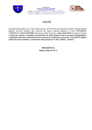 ANUNȚ În temeiul dispozițiilor art 11, alin (5) din Legea nr. 255/2010 privind expropierea pentru cauză de utilitate publică, necesară realizării unor obiective de interes național, județean și local, CONSILIUL JUDEȚEAN CARAȘ-SEVERIN anunță persoanele interesate că luni, 26.02.2024 își începe activitatea Comisia de verificare a dreptului de proprietate sau a altor drepturi […]