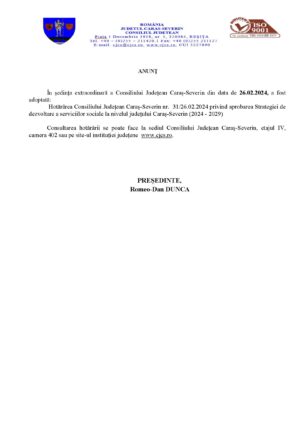 ANUNȚ În ședința extraordinară a Consiliului Județean Caraș-Severin din data de 26.02.2024, a fost adoptată: Hotărârea Consiliului Județean Caraș-Severin nr. 31/26.02.2024 privind aprobarea Strategiei de dezvoltare a serviciilor sociale la nivelul județului Caraș-Severin (2024 – 2029) Consultarea hotărârii se poate face la sediul Consiliului Județean Caraș-Severin, etajul IV, camera 402 sau pe site-ul […]