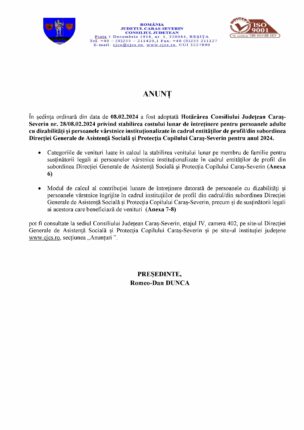 ANUNȚ În ședința ordinară din data de 08.02.2024 a fost adoptată Hotărârea Consiliului Județean Caraș-Severin nr. 28/08.02.2024 privind stabilirea costului lunar de întreținere pentru persoanele adulte cu dizabilități și persoanele vârstnice instituționalizate în cadrul entităților de profil/din subordinea Direcției Generale de Asistență Socială și Protecția Copilului Caraș-Severin pentru anul 2024. Categoriile […]
