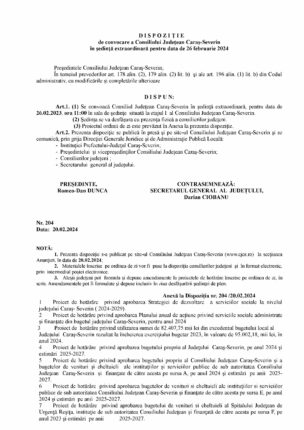 D I S P O Z I Ţ I E de convocare a Consiliului Judeţean Caraş-Severin în şedinţă extraordinară pentru data de 26 februarie 2024 Preşedintele Consiliului Judeţean Caraş-Severin; În temeiul prevederilor art. 178 alin. (2), 179 alin. (2) lit. b) şi ale art. 196 alin. (1) lit. b) din Codul administrativ, cu […]