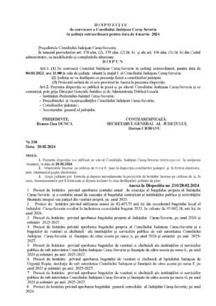 D I S P O Z I Ţ I E de convocare a Consiliului Judeţean Caraş-Severin în şedinţă extraordinară pentru data de 4 martie 2024 Preşedintele Consiliului Judeţean Caraş-Severin; În temeiul prevederilor art. 178 alin. (2), 179 alin. (2) lit. b) şi ale art. 196 alin. (1) lit. b) din Codul administrativ, cu […]