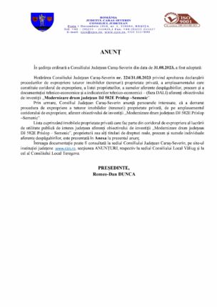Exproprieri pentru proiectul „Modernizare drum județean DJ 582E Prislop –Semenic”.