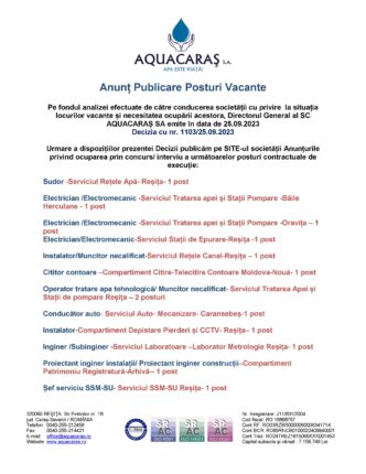Anunț Posturi Vacante Aquacaraș