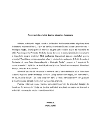 Primăria Municipiului Reşiţa, titular al proiectului “Reabilitarea zonelor degradate aflate în interiorul microraioanelor 2, 3 și 4 din cartierul Govândari și zona Calea Caransebeșului – Municipiul Reșița”, anunță publicul interesat asupra luării deciziei etapei de încadrare de către Agenția pentru Protecția Mediului Caraș-Severin, în cadrul procedurii de evaluare a impactului asupra mediului: fără evaluarea impactului […]