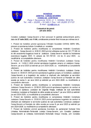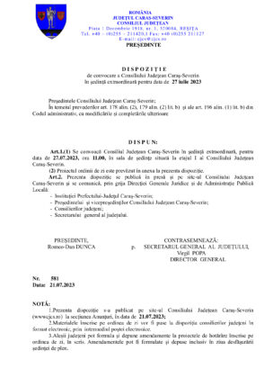 D I S P O Z I Ţ I E de convocare a Consiliului Judeţean Caraş-Severin în şedinţă extraordinară pentru data de 27 iulie 2023