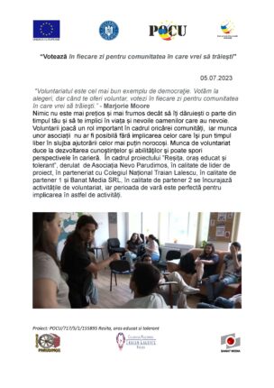 Centrul civic al Reșiței s-a umplut de energie, muzică și dans. Asta deoarece tinerii de la Nevo Parudimos au creat un flash mob, prin care au dorit să promoveze implicarea civică, toleranța și voluntariatul, atitudini promovate prin proiectul „Reșița, oraș educat și tolerant”.