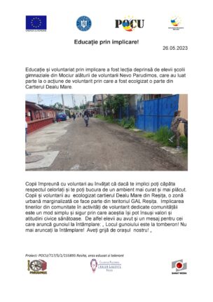 Educație și toleranță prin implicare, a fost lecția deprinsă de elevii școlii gimnaziale din Mociur, alături de voluntarii Nevo Parudimos, care au luat parte la o acțiune de voluntarit, prin care a fost ecolgizat o parte din Cartierul Dealu Mare.