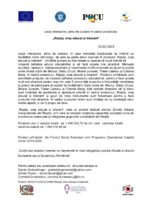 Lecții interactive, pline de culoare, în care metodele tradiționale se îmbină cu facilitățile noilor tehnologii, de asta au parte elevii implicați în proiectul „Reșița, oraș educat și tolerant”. Unitățile școlare au fost dotate cu aparatură nouă menită crească calitatea actului educațiobal și să facă școala mai atractică.