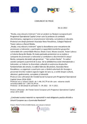 Prin intermediul proiectului:” Reșița, oraș educat și tolerant” se crează rețele de comunicare între cadre didactice, elevi, voluntari și specialişti, în vederea modelării unor atitudini favorabile integrării sociale în spiritul valorilor contemporane: toleranţă, acceptare, empatie, umanitarism și implicare civică.
