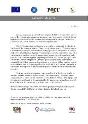 În cadrul proiectului „Reșita, oraș educat și tolerant”, Cod SMIS : 155895, finanțat prin Programul Operațional Capital Uman, 200 de copii din cartierelor Mociur, Dealu Crucii, Moara Juracek, Traian Lalescu și Colonia Baraj din Reșița beneficiază de programul Școală după Școală, de trusouri de haine, de rechizite școlare și mai ales de activități culturale și […]