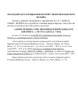 Anunț public privind depunerea solicitării de emitere a acordului de mediu