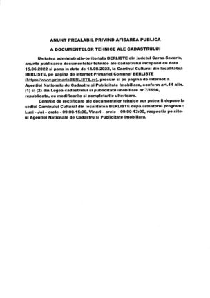 Afișarea publică a documentelor tehnice ale cadastrului – Berliște