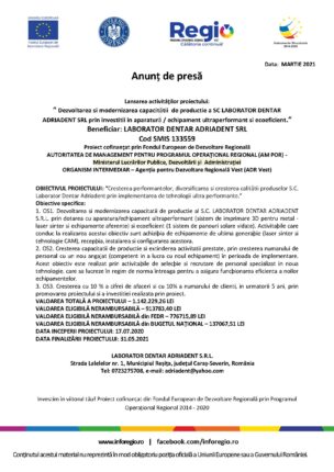 Lansare proiect SC Laborator Dentar Adriadent SRL