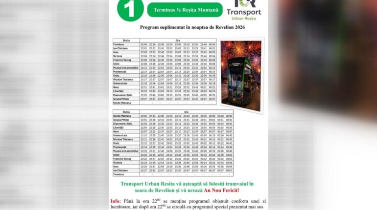 Reprezentanți ai Transport Urban Reșița (TUR), au transmis – Programul de REVELION & Început de Ianuarie Stimați călători, Vă informăm că, în perioada 31 decembrie – 7 ianuarie, programul de circulație va fi următorul: 31 DECEMBRIE (Revelion) – TRAMVAIE Până la ora 22:00: program normal După ora 22:00: program special (conform graficului afișat) PROGRAM […]