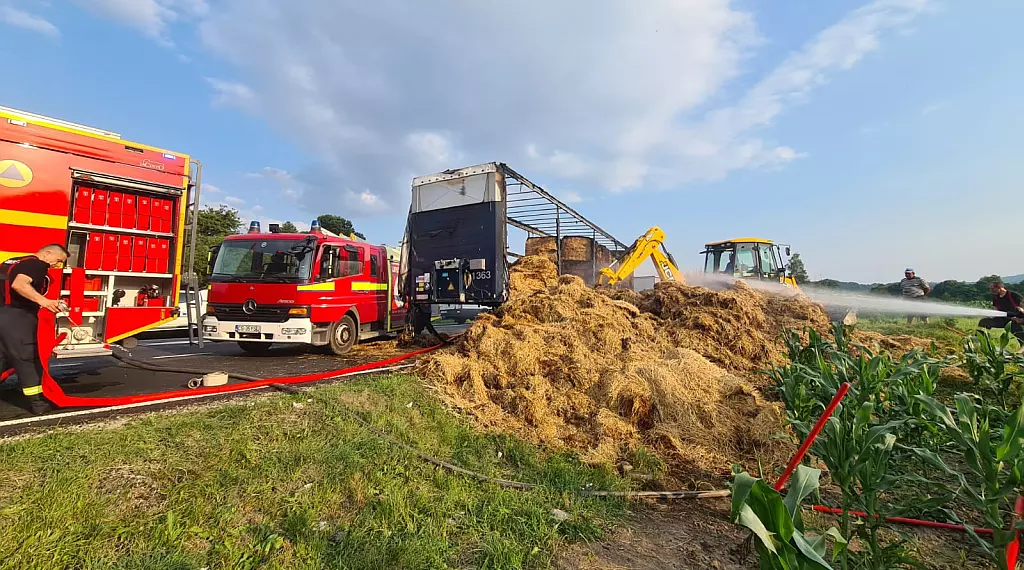 Un autocamion încărcat cu baloți de paie a fost cuprins de flăcări, pe DN6, pe raza localității Teregova.