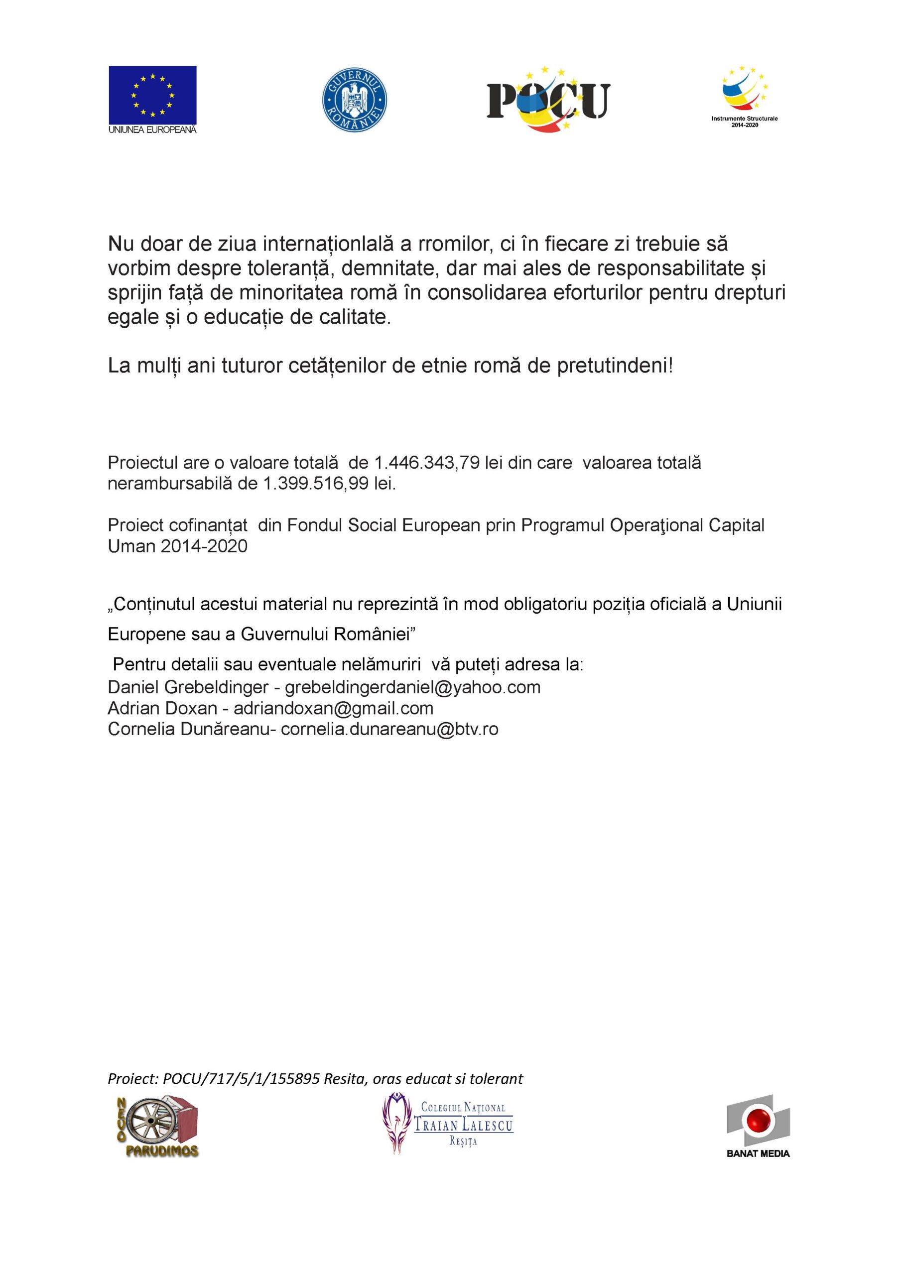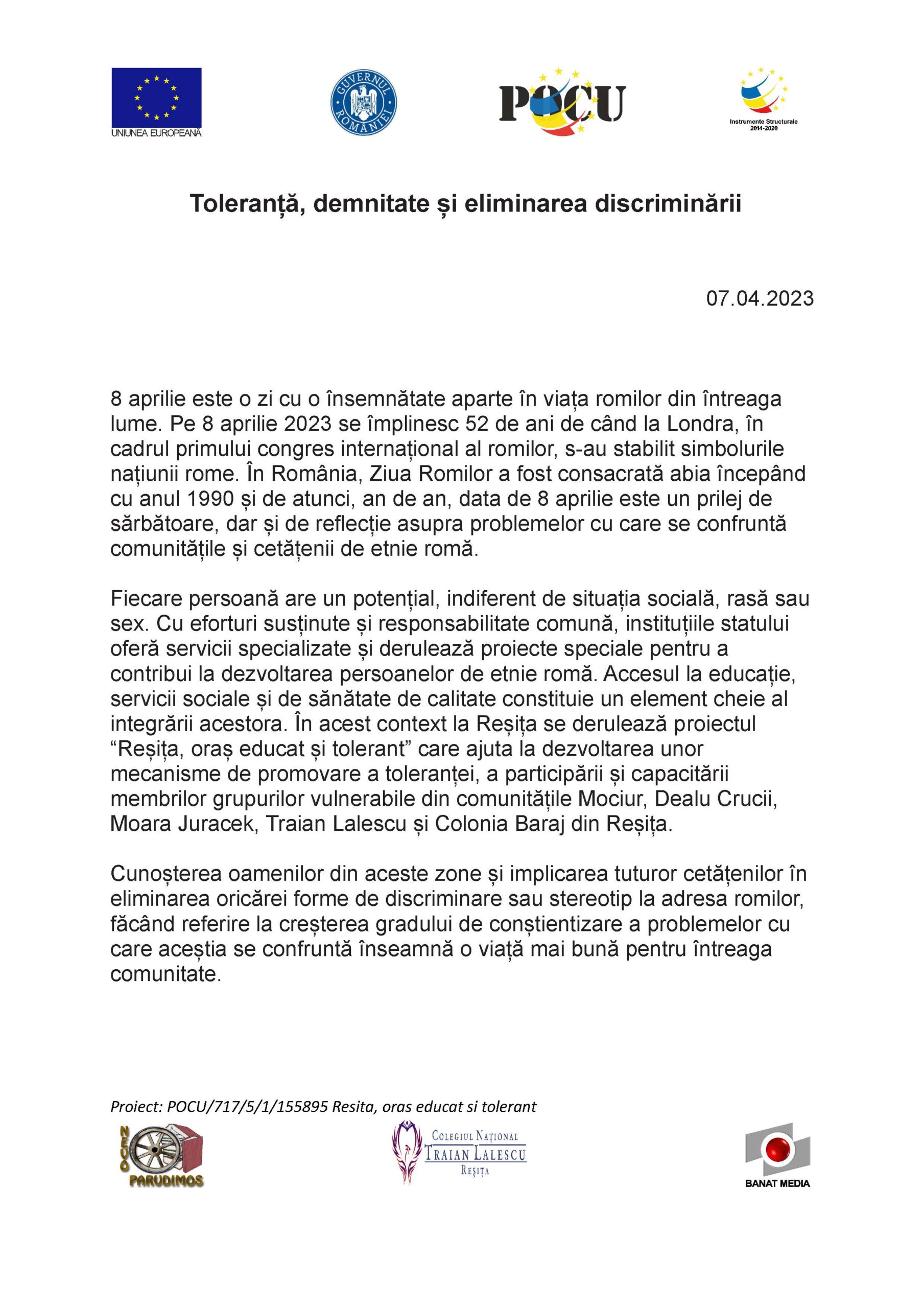 07APR. Comunicat de presă 26 – Toleranță, demnitate și eliminarea discriminării Post Author: Cornelia Dunăreanu