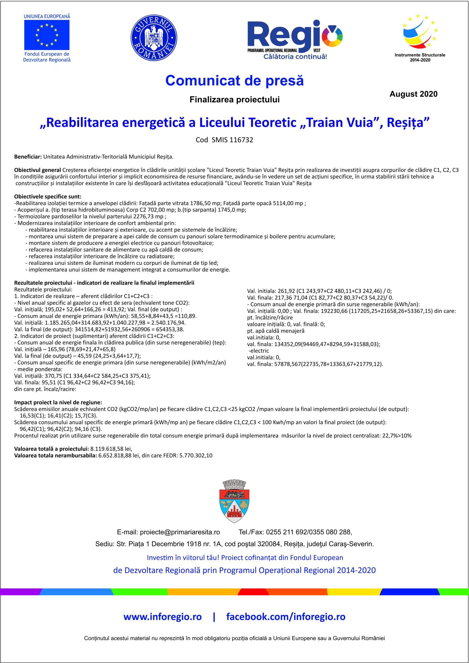 Creșterea eficienței energetice în clădirile unității școlare Liceul Teoretic Traian Vuia Reșița