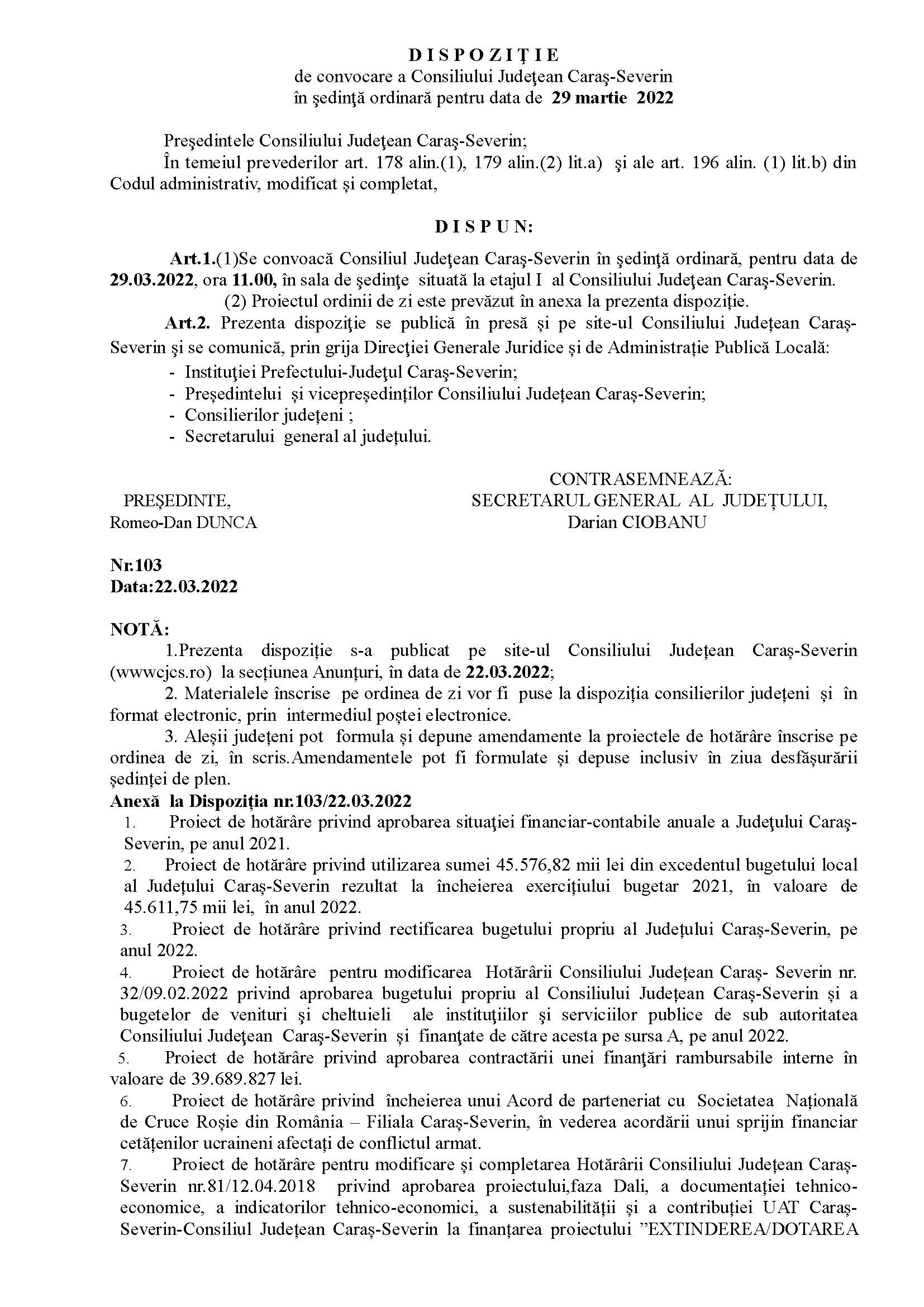 23MART. Dispoziție de convocare a Consiliului Judeţean Caraş-Severin în şedinţă ordinară. Post Author: Cornelia Dunăreanu
