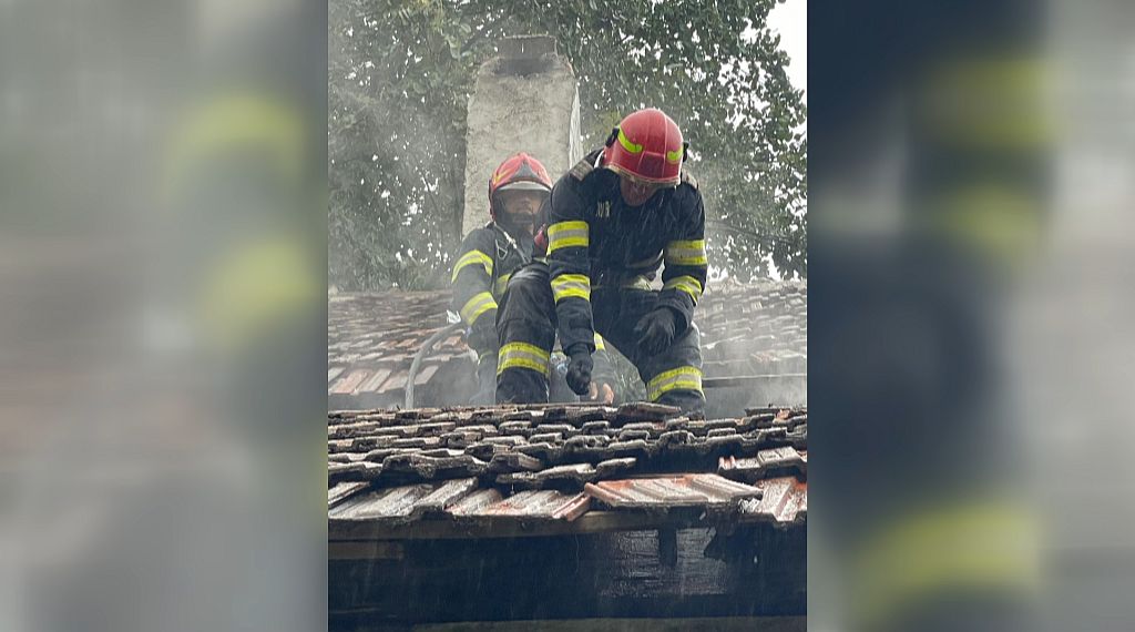 Incendiul este localizat și se manifestă la acoperișul casei pe o suprafață de aproximativ 200 mp.