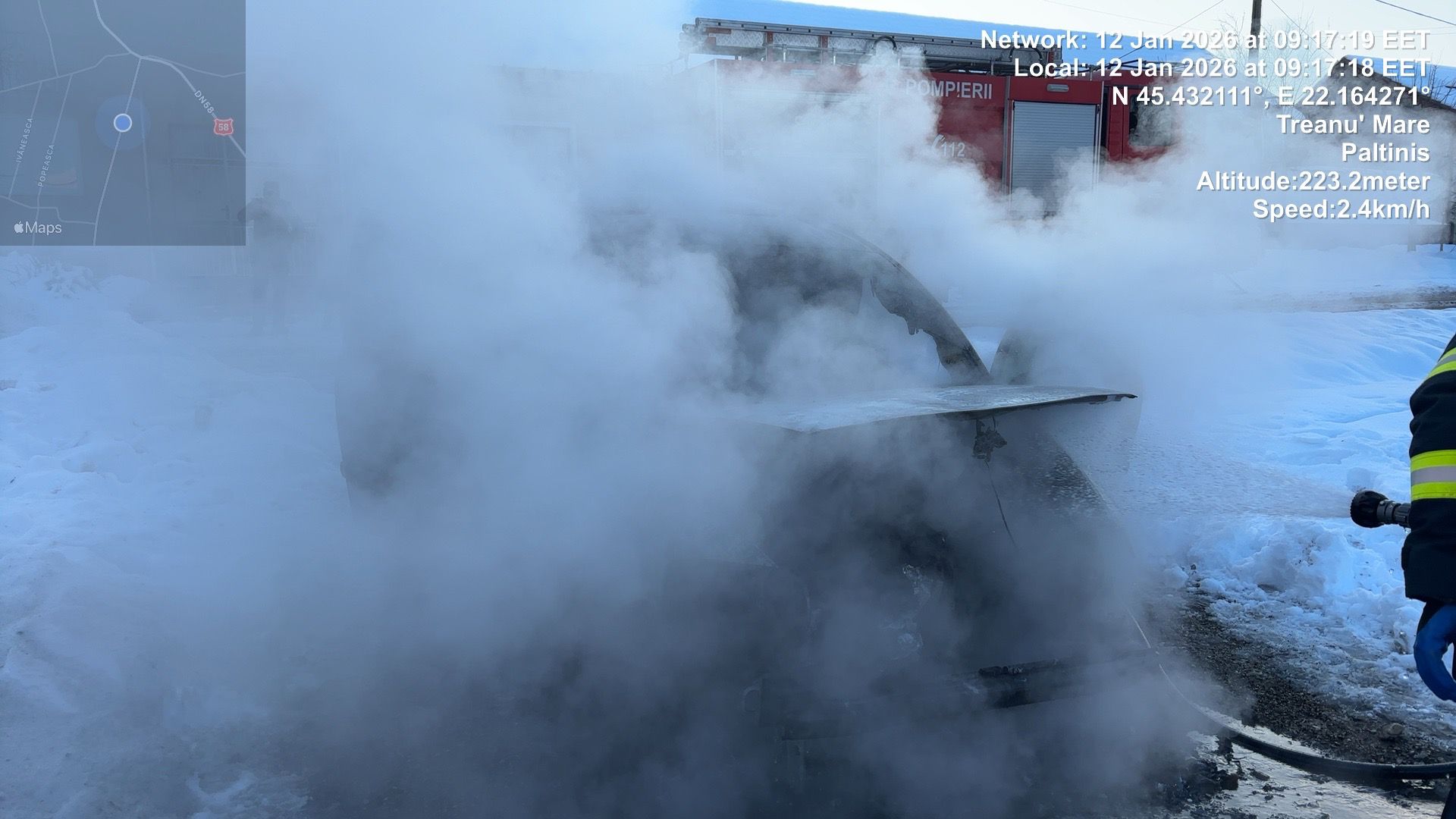 Echipajele de intervenție din cadrul Detașamentului de Pompieri Caransebeș au intervenit cu o autospecială de stingere pentru lichidarea unui incendiu izbucnit la un autoturism, aflat pe raza localității Păltiniș.
