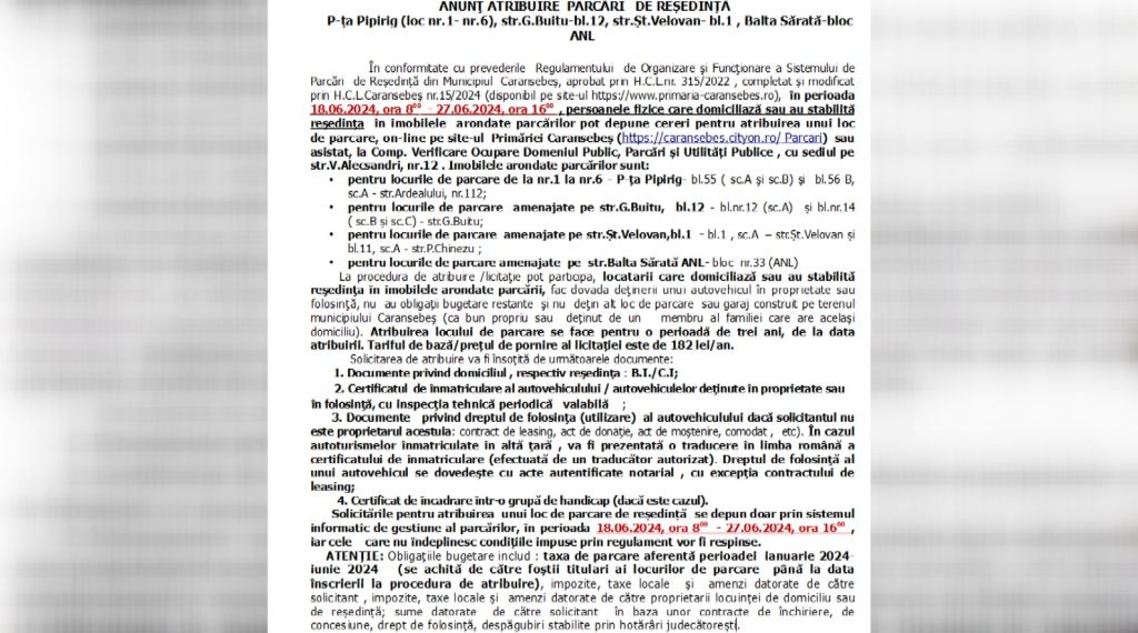 În perioada 18 iunie – până pe data de 27 iunie, în intervalul orar 08-16.00, persoanele fizice care domiciliază sau au stabilă reședința în imobilele arondate parcărilor pot depune cereri pentru atribuirea unui loc de parcare. Cererile se pot depune online pe site-ul primăriei Caransebeș, caransebeșcityon.ro, sau mai pot depune cereri asistați la Compartimentul de verificare, ocupare Domeniul Public, Parcări și Utilități Publice, cu sediul pe strada Vasile Alecsandri nr.12.