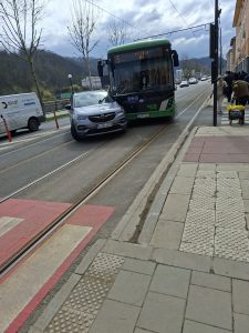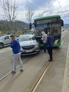 Un șofer nu s-a asigurat în momentul în care a vrut să schimbe direcția de mers, nu a acordat prioritate de trecere unui autobuz aflat în circulație și a fost lovit de autobuzul care circula regulamentar.