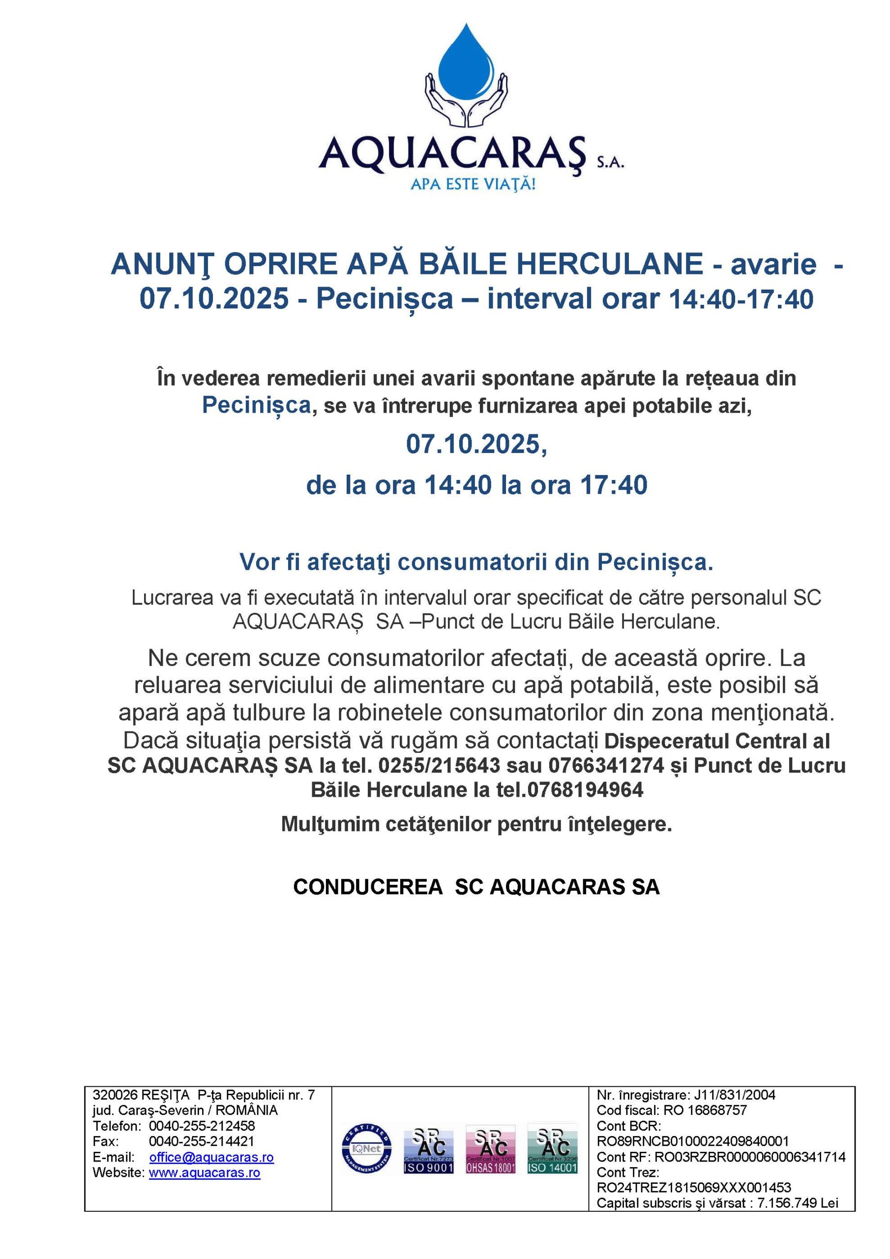 În vederea remedierii unei avarii apărute la rețeaua de apă, s-a întrerupt furnizarea apei potabile, între orele 11:00...