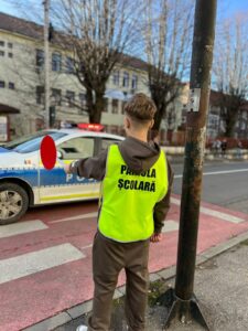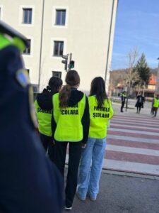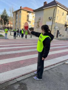 Tinerii implicați au contribuit activ la siguranța colegilor și a pietonilor, oferind sprijin pentru traversarea regulamentară a străzii în zona unității de învățământ.
