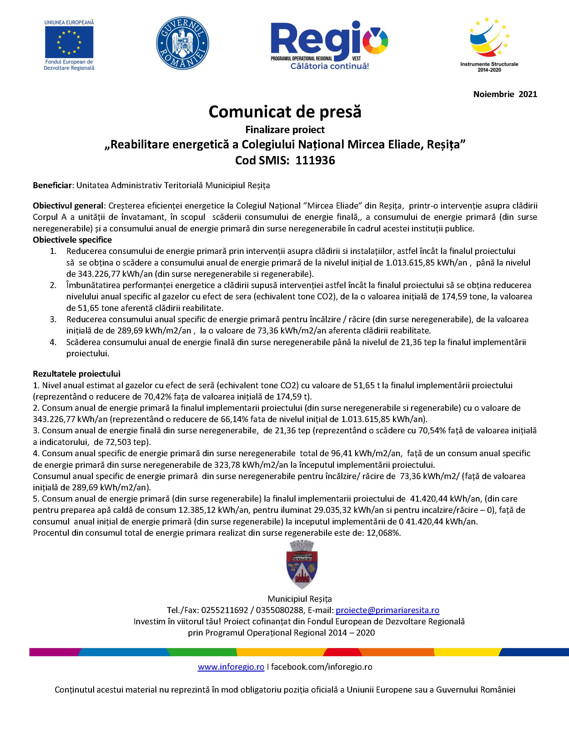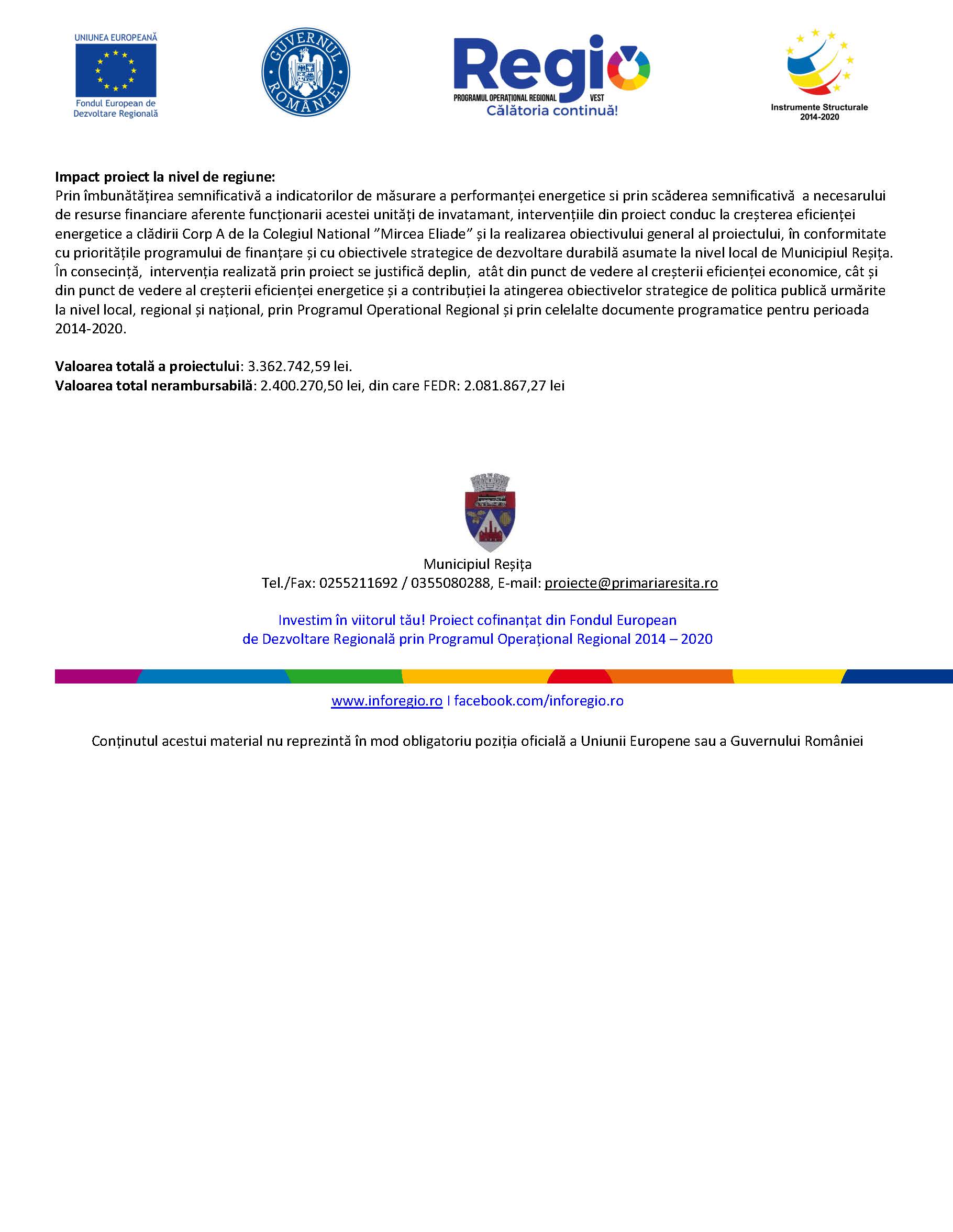 „Reabilitare energetică a Colegiului Național Mircea Eliade, Reșița”