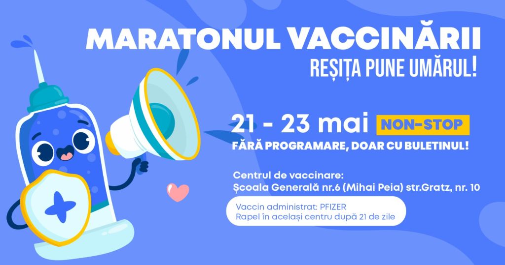Participă și tu la Maratonul Vaccinării! Doar împreună putem face încă un pas către revenirea la normalitate! Împreună pentru Reșița! este mesajul primăriei Reșița care începând de vineri, 21 mai, ora 08:00, până duminică, 23 mai, ora 20:00 va desfășura un maraton de vcaccinare la Centrul de de la Școala Gimnazială ”Mihai Peia”. Aici se vor putea vaccina fără programare, doar cu buletinul, locuitorii din Reșița, dar și cei din alte localități, cu vârsta de peste 16 ani. Serul utilizat pe parcursul celor trei zile este Pfizer-BioNTech.