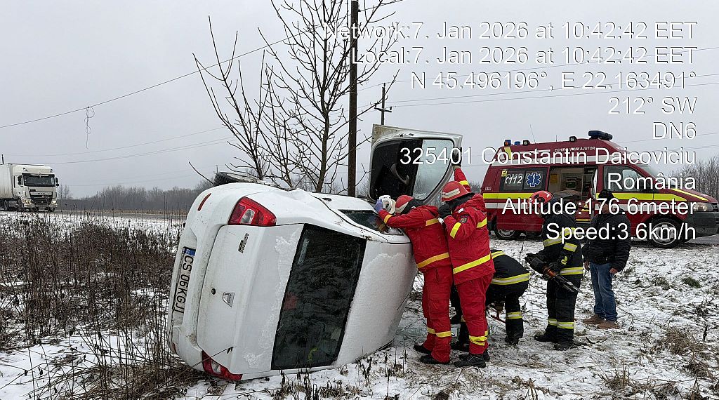 Încă un accident rutier s-a produs pe DN6, în apropierea localității Constantin Daicoviciu, unde un autoturism s-a răsturnat în afara părții carosabile.