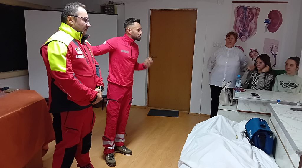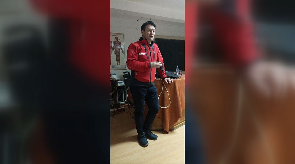 Sebastian Lungu, salvator si paramedic în cadrul Serviciului Salvamont, a făcut o demonstrație practică de prim ajutor, iar Cristian Brecica, salvatorul premiat de Președintele României, a fost însoțit de cățelușa Vreni, erou în misiunile de căutare din Turcia.