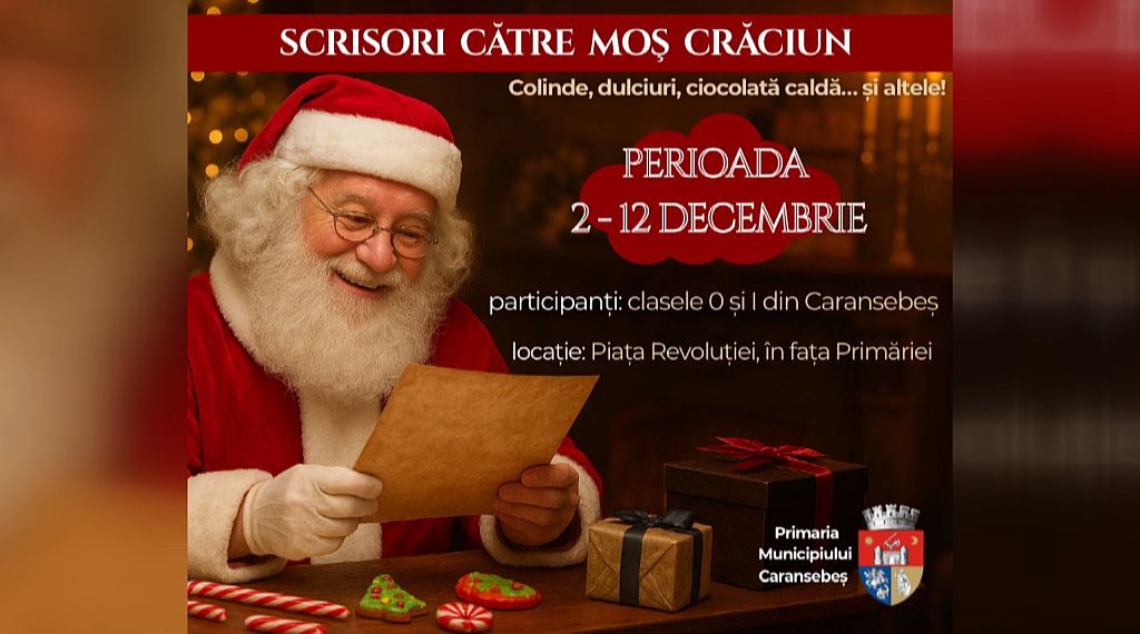 Primăria Municipiului Caransebeș organizează în acest an evenimentul „Scrisori către Moș Crăciun”, unde sunt așteptați toți copiii din clasele pregătitoare si I din localitate.