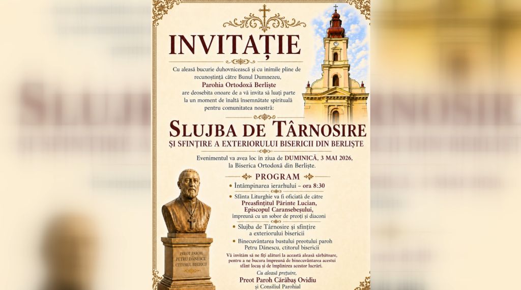 Biserica Ortodoxă din Berliște va îmbrăca haine de sărbătoare duminică, 3 mai, când va avea loc slujba de târnosire și sfințire a exteriorului lăcașului de cult. Ceremonia va fi oficiată de Episcopul Caransebeșului, Preasfințitul Părinte Lucian.